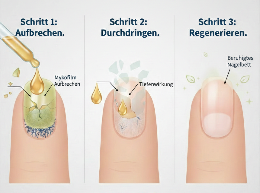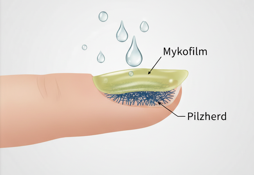 Das Problem: Herkömmliche Mittel perlen an diesem Film oft einfach ab oder dringen nicht tief genug vor. Der Pilz überlebt in seiner „Festung“ und schlägt wieder zu, sobald die Behandlung gelockert wird.